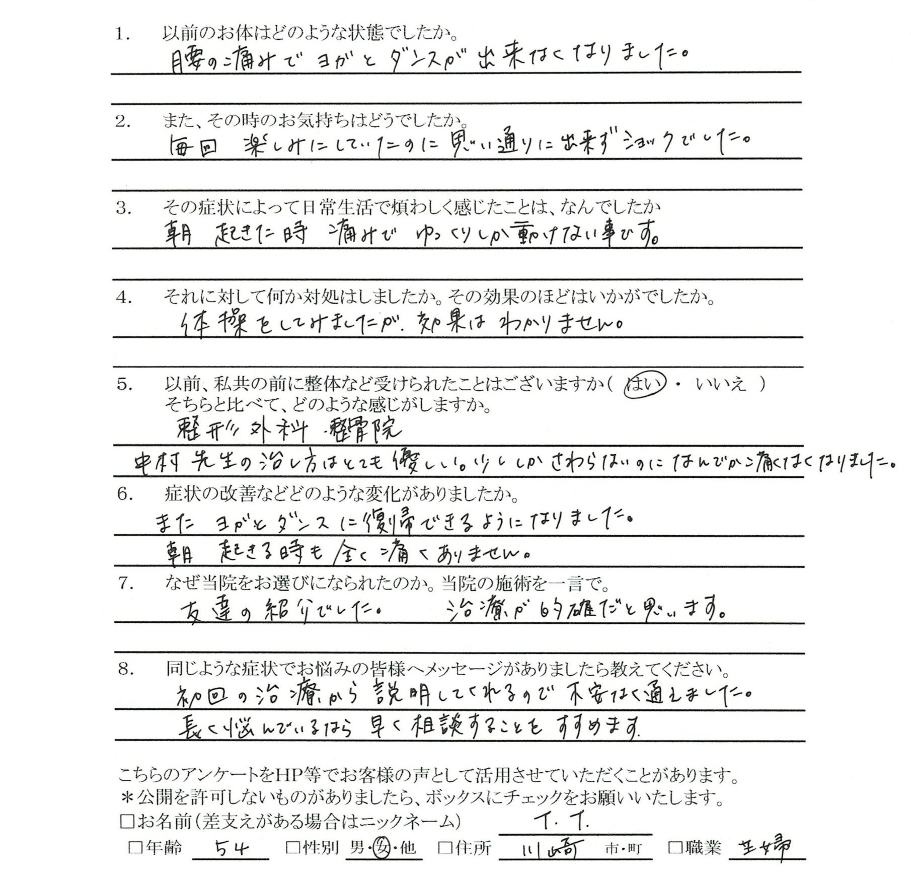当初(改善まで)半年を見込んでいましたが、介護職のため日々緊張感から全身の柔軟性、自律神経の不調等が改善されてきました。結果3回目施術後から腰痛は残るものの、困っていた足の激痛がなくなりました。よって夜間痛もなく、睡眠が戻り、ほぼほぼ日常生活を取り戻しました。